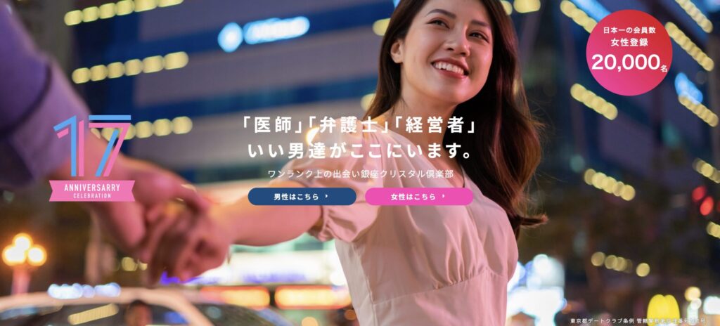 銀座クリスタル倶楽部は、日本で唯一、女性スタッフだけで運営されている老舗の交際クラブ。18年以上の歴史を持ち、全国15都市にネットワークを展開。地方在住の方や、初めての方でも安心して利用できるサービスになっています。