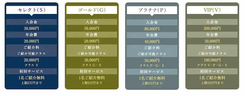 青山プラチナ倶楽部には、仮会員を除いてゴールド・プラチナ・特別プラチナ・特別VIPの4段階のクラスがあります。
