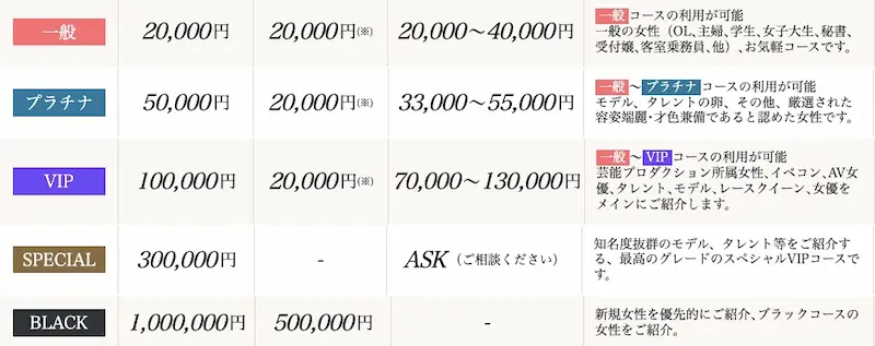 | VIP(V) | ★★★★☆ | 20万円 | 10万円 | 女子アナ、タレント | 20代前半が多い |