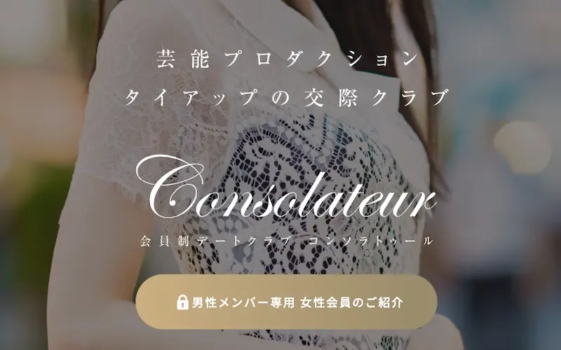 コンソラトゥールは、2007年に開設された全国6都市展開の高級会員制交際クラブです。最大の特徴は、芸能プロダクションと直結した運営で、テレビやイベントで活躍するモデル、グラビア、レースクイーンなどのハイレベルな女性が多く在籍しています。